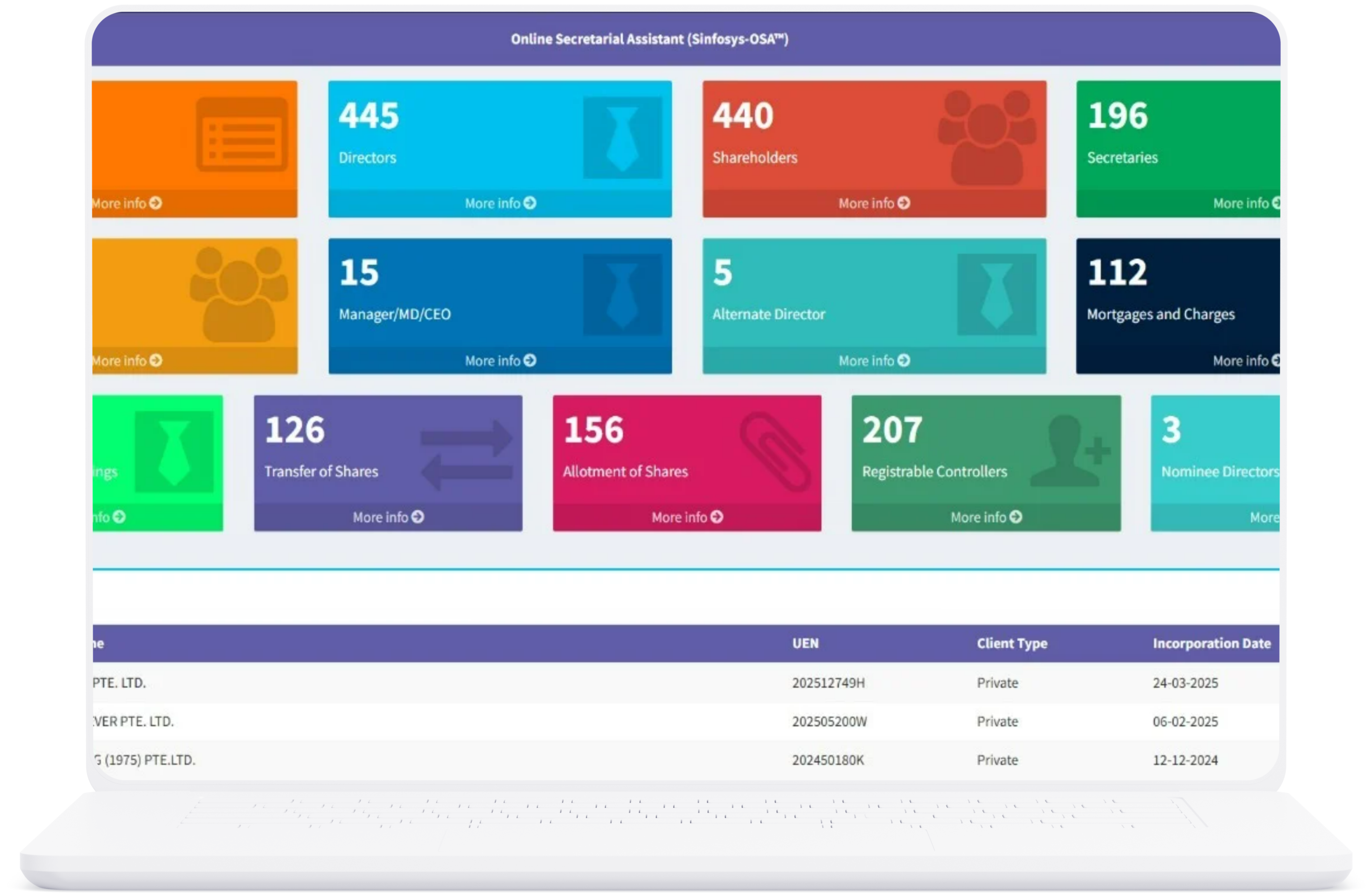 Sinfosys OSA - "Online Secretarial Assistant is a simple, comprehensive, easy to use, integrated secretarial administration program especially designed for any organisation. Sinfosys OSA makes the task of keeping secretarial records so easy that you can delegate it to a junior clerk. The program is so user friendly anyone can master it within few hours.Some of these features can be considered indispensable. Sinfosys OSA is a new class of cloud secretarial assistant software that intuitively integrates company incorporation, Register book and corporate resolutions into a single application.